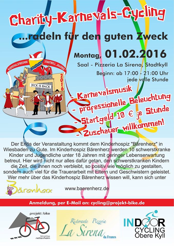 Das karnevalistische Indoor Cycling Event startet am Montag, 01.02. um 18:00/ 19:00/ 20:00 und 21:00 Uhr bei Karnevalsmusik und mit entsprechender Beleuchtung.
